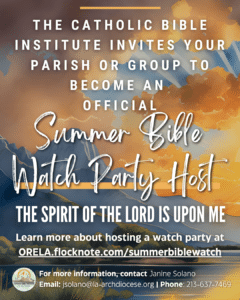 As an Official Summer Bible Watch Party Host Parish or Group, you are invited to provide a space for this weeklong retreat to build community for participants to reflect on the Word of God and how they may live a life inspired by the Spirit. The participants you host will gather in-person to watch the Summer Bible Week programming online and engage in reflections together.
