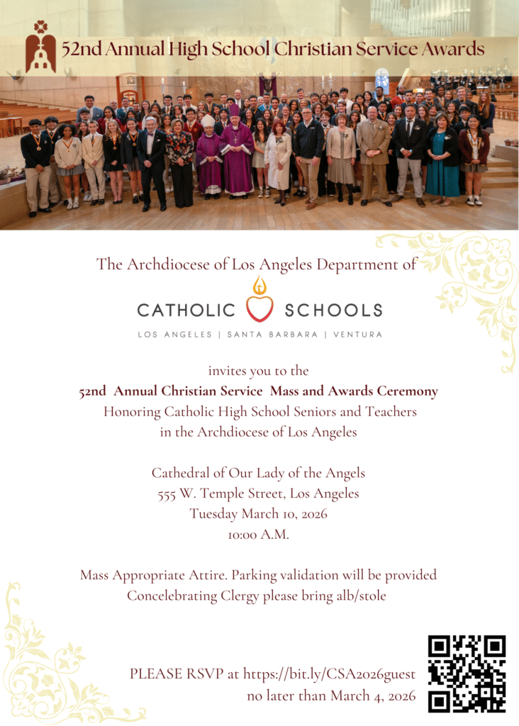 Sixty-nine students and 7 teachers will be honored at the 52nd Annual Christian Service Awards Mass presided by Archbishop José H. Gomez. The Mass will take place on Tuesday, March 10, 2026 at 10 a.m. at the Cathedral of Our Lady of the Angels.