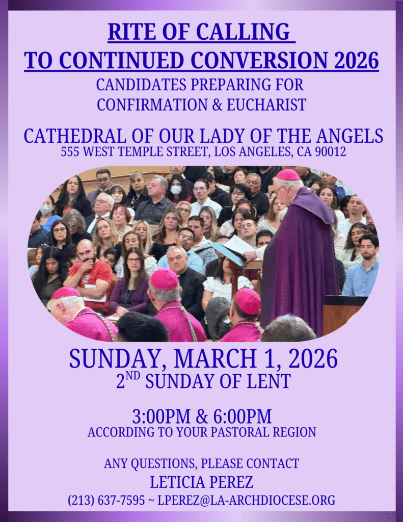 La Oficina para el Culto Divino invita a todos los Candidatos que se preparan para la Confirmación y la Eucaristía al Rito de Llamado a la Conversión Continua 2026 el domingo 1 de marzo de 2026 en la Catedral de Nuestra Señora de los Ángeles. El Rito de Llamado se llevará a cabo a las 3 p.m. y a las 6 p.m. de acuerdo a su región pastoral. No se necesita el Libro de los Elegidos para este rito.