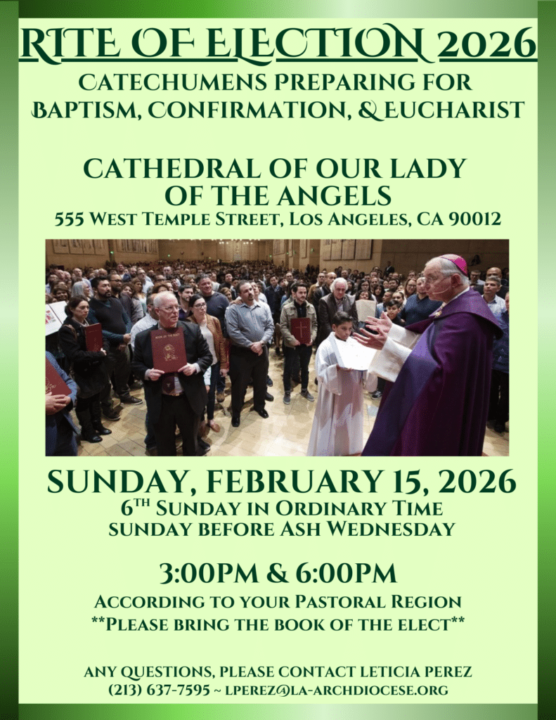 La Oficina para el Culto Divino invita a todos los catecúmenos que se preparan para el Bautismo, la Confirmación y la Eucaristía al Rito de Elección 2026, el domingo 15 de febrero de 2026, en la Catedral de Nuestra Señora de los Ángeles. El Rito de Elección se llevarán a cabo a las 3pm y a las 6pm de acuerdo a su región pastoral. Por favor, traigan el Libro de los Elegidos.