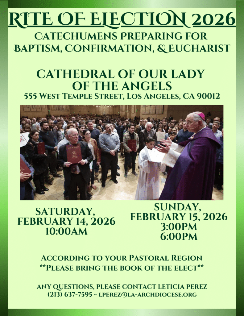 The Office for Divine Worship invites all Catechumens preparing for Baptism, Confirmation, and Eucharist to join the Rite of Election 2026 on Saturday, February 14, 2026 at 10am and Sunday, February 15, 2026 at 3pm and 6pm at the Cathedral of Our Lady of the Angels.