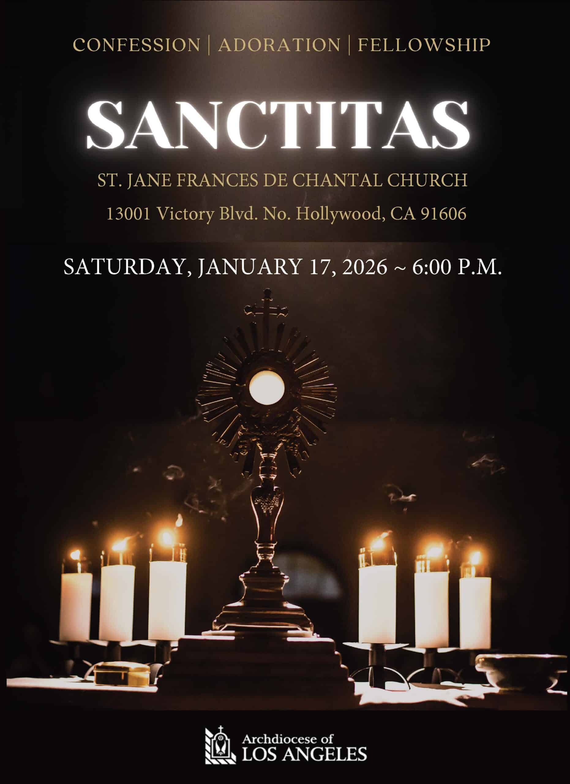 Join us for an evening of adoration, confession and fellowship especially geared towards young adults. This ‘Sanctitas’ event will be at St. Jane Frances de Chantal Church (North Hollywood) on Saturday, January 17th at 6pm.