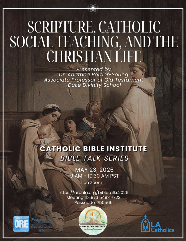 The Catholic Bible Institute: Bible Talks Series will have a talk ‘Scripture, Catholic Social Teaching, and the Christian Life’ presented by Dr. Anathea Portier-Young, Associate Professor of Old Testament at Duke University on May 23, 2026 from 9am-10:30am (PT) via Zoom.